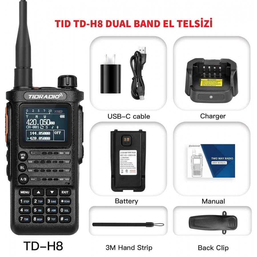 TID TD-H8, kompakt yapısı ve VHF/UHF dual band desteği ile hem profesyonel hem de amatör kullanıcılar için ideal bir el telsizidir. Güçlü alıcı performansı, net ses çıkışı, dayanıklı gövdesi ve uzun batarya süresi ile zorlu şartlarda bile kesintisiz iletişim sağlar.